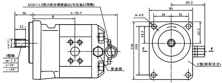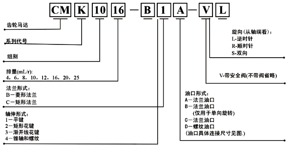 CMK1系列齒輪馬達可單向旋轉,也可雙向旋轉,單向旋轉時(shí)還可以帶安全閥,供用戶(hù)任意選用。