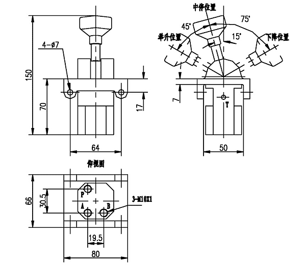 ¡¡¡¡®”ÊÖ±úÔÚ¡°ÖÐÍ£¡±Î»ÖÕr(sh¨ª), P¿ÚêP(gu¨¡n)é], A¡¢B¿Ú²»¹¤×÷£»®”ÊÖ±úÔÚ¡°ÅeÉý¡±Î»ÖÕr(sh¨ª),P¿ÚÅcA¿ÚÏàͨ,B¿Ú²»¹¤×÷£»®”ÊÖ±úÔÚ¡°Ï½µ¡±Î»ÖÕr(sh¨ª)£¬P¿ÚÅcB¿ÚÏàͨ£¬P¿ÚÅcA¿ÚÏàͨ,A¿Ú²»¹¤×÷¡£